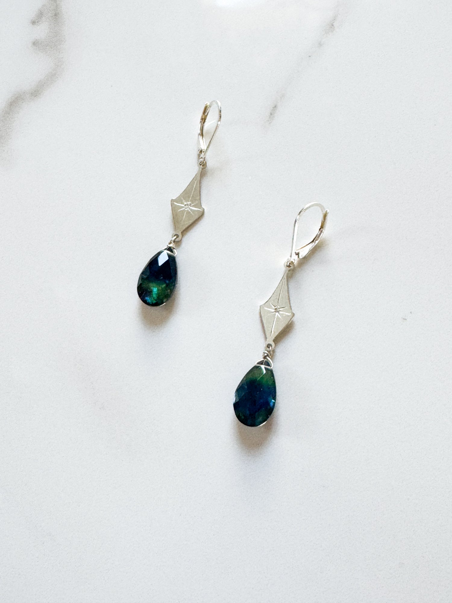 These hand-cut Sterling Silver earrings are also hand-engraved and accented with Abalone drops. These earrings are long, approx 2” in length.