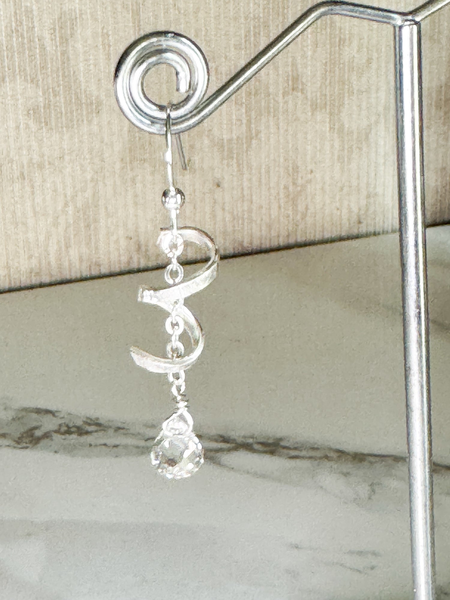 These fun confetti Quartz earrings are perfect for the holiday season. The sterling ribbon is hand cut and hand engraved. They measure about one and a half inches long and are accented with a Quartz drop.