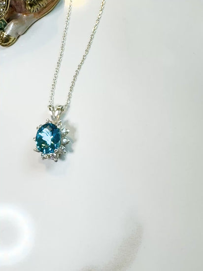 This beautiful fancy cut checkerboard Swiss Blue Topaz is set in a classic setting accented with 2 mm CZs all around. It’s done in Sterling and comes on an 18 in Sterling silver chain.