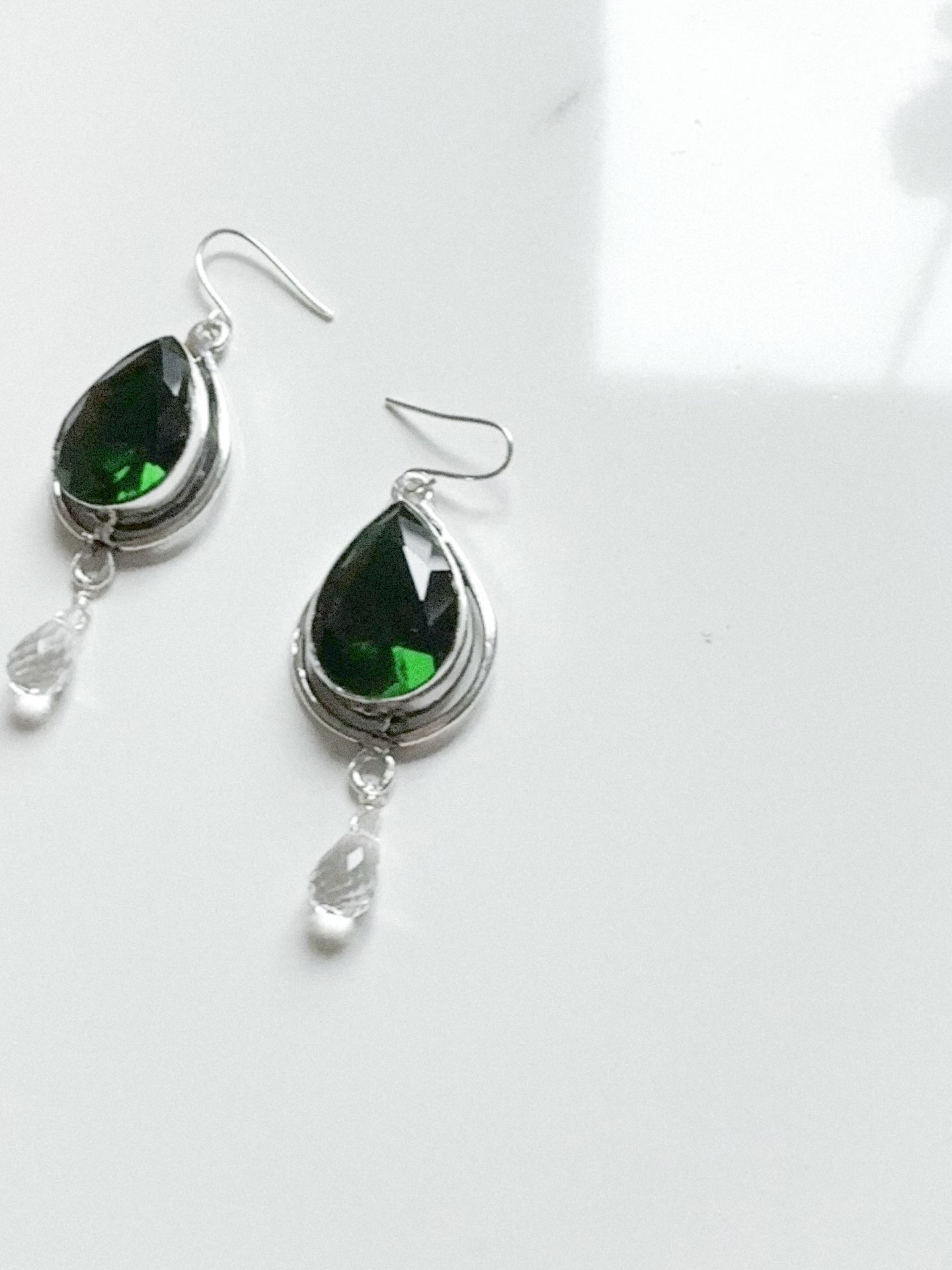 These large green quartz earring really make a statement. They are accented with clear quartz drops done in sterling silver.
