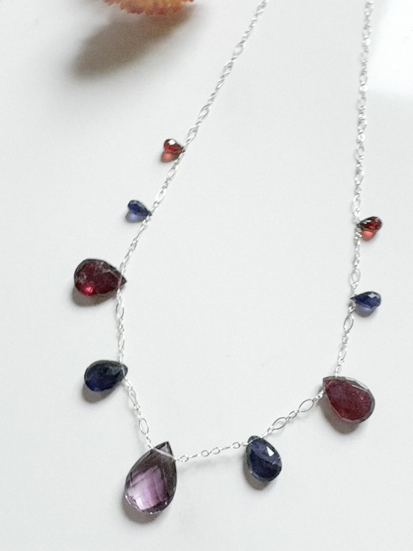 This beautiful necklace is adorned with Sapphire, Garnet, Rhodalite Garnet, Iolite and Amethyst drops. Please note the sterling silver chain is delicate.