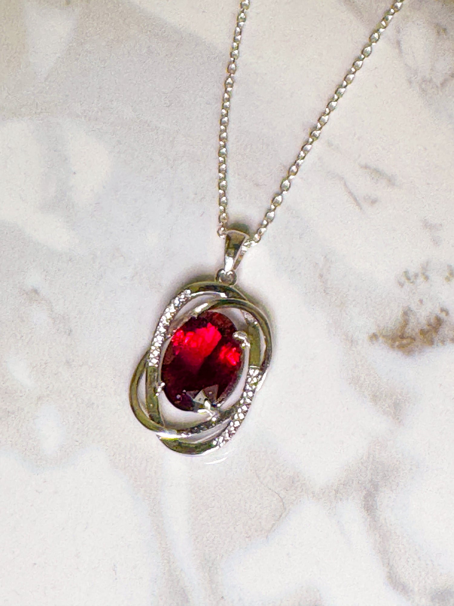 This unique Rhodolite Garnet necklace is done in Sterling and accented with CZs. It comes on a 17” chain with extender.